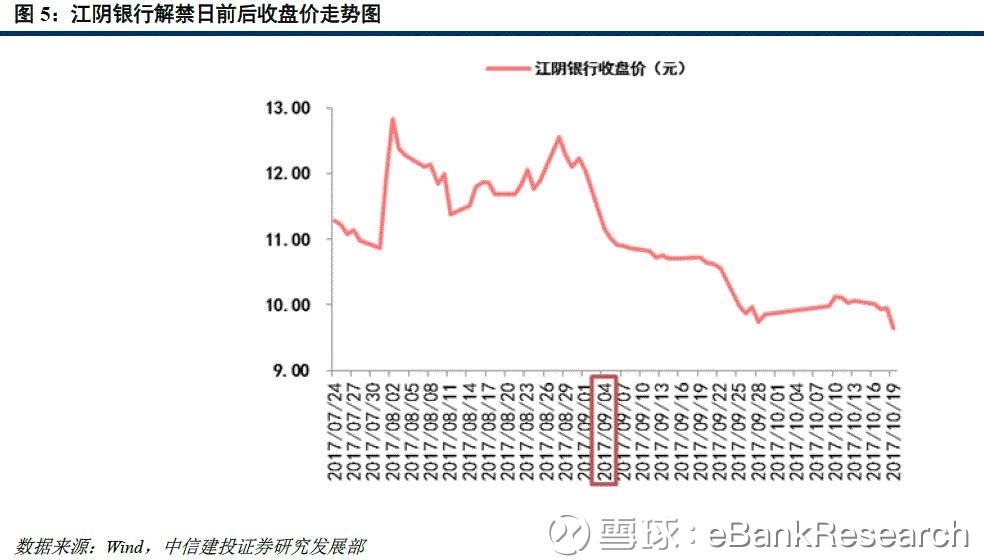 同时,以解禁的6家银行为例,其中常熟银行、江阴银行、无锡银行明显高于行业平均值,而这三家银行业也正是在此次解禁大潮中股价受影响较大银行,正好印证了在解禁发生后,虚高的估值只能带来估值的回归,原始股东会有套现的冲动,从而对股价形成压力。