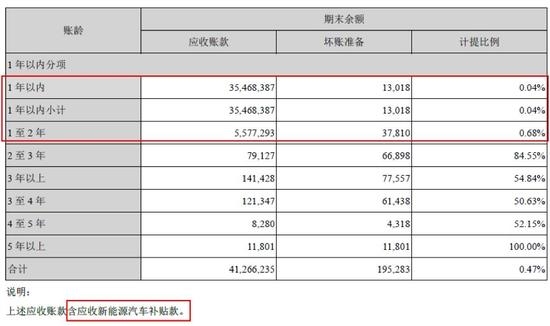 截至2016年末,比亚迪账上对2年内应收账款的计提比例约为0.12%,这和不计提也没什么太大差别了。注意,在上面这张表的说明部分,比亚迪备注说“上述应收账款含应收新能源汽车补贴款”。