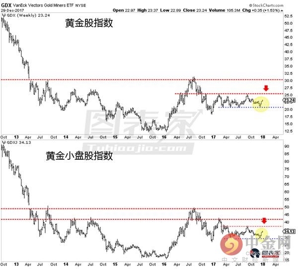 在2017年,空头有多次机会使黄金股下行,但是价格始终维持在2016年12月低点和2016年大涨的斐波那契62%回调位之上。因此,尽管黄金股并未在2017年向上破位,但是其价格数次站稳关键支撑以及近期的反弹意味着卖压减少。