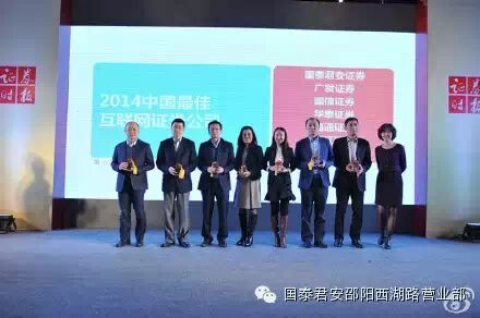 12月12日,由证券时报社主办的“2014中国互联网金融跨界变革峰会暨第十五届金融IT创新评选”揭晓榜单,国泰君安获“最佳互联网证券公司”大奖。推动公司业务的全面互联网化,通过互联网向客户提供包括生活消费、支付、理财、交易、投资、融资等综合金融服务始终是我们的不懈追求!