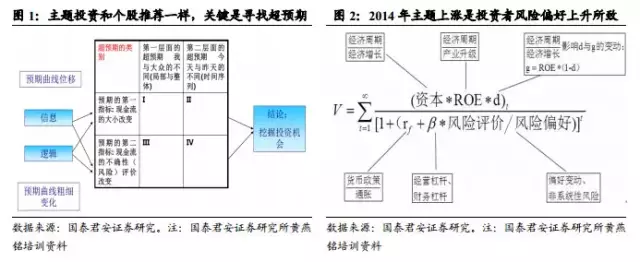 从 DDM 模型看,任何一个 DDM 的指标变动都可以形成主题投资。包括分子端现金流的大小改变和分母端现金流的不确定性(风险)评价改变。回顾 2014 年的主题投资行情,主题板块上涨主要由 DDM 分母端投资者风险溢价快速下降所致,而决定风险溢价下降的是投资者风险偏好的快速上升。风险偏好是投资者承担风险的意愿,反映了投资者对未来风险收益比率的预期。同时,风险偏好是整个 DDM 模型里波动比较剧烈的一个变量,具有不稳定性,也是主题投资往往有爆发性的主要原因。在主题起来的时候,投资者往往会忽视下跌风险而高估向上的收益,导致风险偏好上升,整个市场风险偏好又会推高价格。这种相互加强的过程会在某一事件出现时被突然打断,投资者对风险重新评估后风险偏好迅速下降,主题开始自我加强式的下跌过程。以上也描述了主题的形成和消退过程,主题形成和股票价格形成一样,是人们预期交换的结果。只是主题投资的短时噪声信号更多,羊群效应表现更为明显。