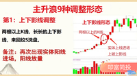 大家好,我是叩富简投小富。 想要在股市赚到钱就得做主升浪确立的行情,而想要拿得住,更需要在持股的过程中能拿的住。今天总结了主升浪9种调整形态,希望对大家有帮助! 第一种:上下影线调整 两根以上K线,长长的上下影两根以上的K线线,来回绞S洗盘。 注意:再次出现实体阳线进场,阳